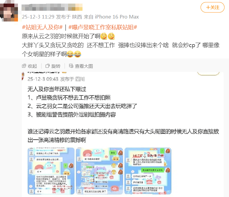 有人扒出无人及你当年的私下爆料,她说卢昱晓贪玩,不想工作不想拍照营业,虽然公司在强推她,但她还是天天出去玩,甚至吃胖了,还因为提前外泄拍摄内容被剧组警告过。