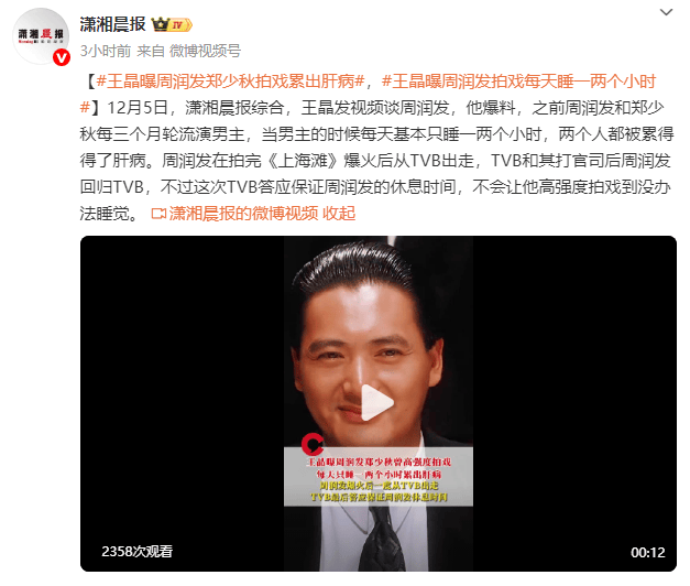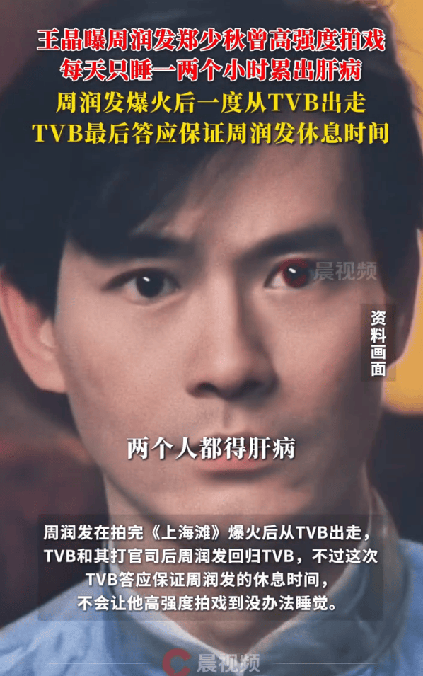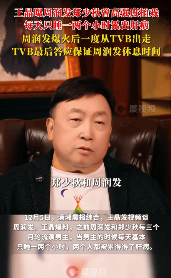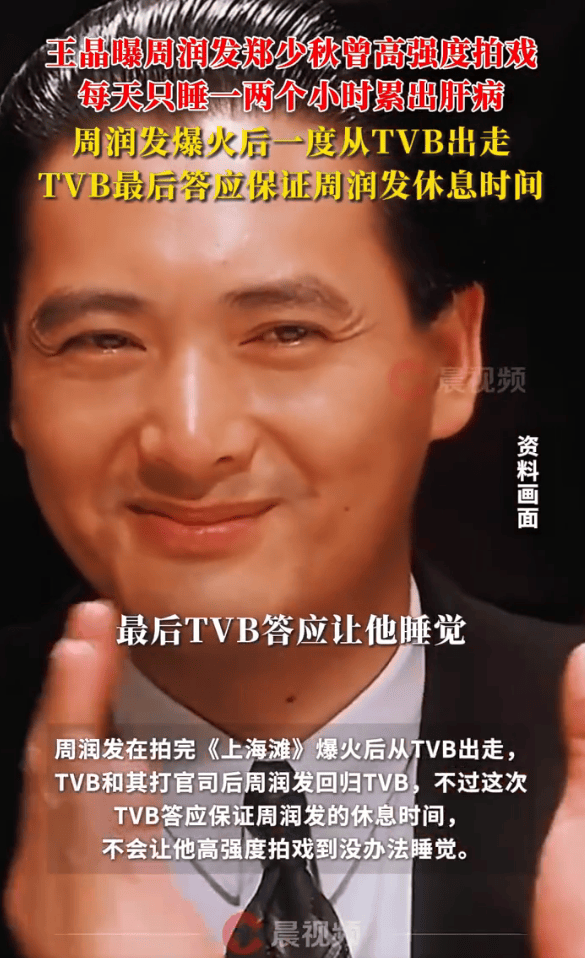 12月5日,潇湘晨报综合,王晶发视频谈周润发,他爆料,之前周润发和郑少秋每三个月轮流演男主,当男主的时候每天基本只睡一两个小时,两个人都被累得得了肝病。周润发在拍完《上海滩》爆火后从TVB出走,TVB和其打官司后周润发回归TVB,不过这次TVB答应保证周润发的休息时间,不会让他高强度拍戏到没办法睡觉。