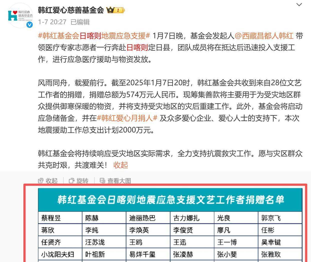 第二天,韩红基金会发了一份公告,表示将向灾区捐赠1000万元,然后立刻启动了应急反应体系。
