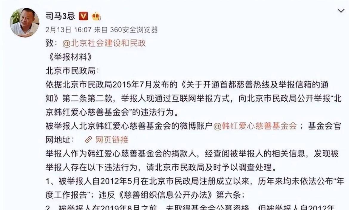 在2020年,韩红正忙于武汉前线的工作,突然有个叫“司马3忌”的博主发出长文,实名指控她“贪污上亿善款”,还列出了所谓的“六大罪状”,配上了一些看似专业的截图和数据。
