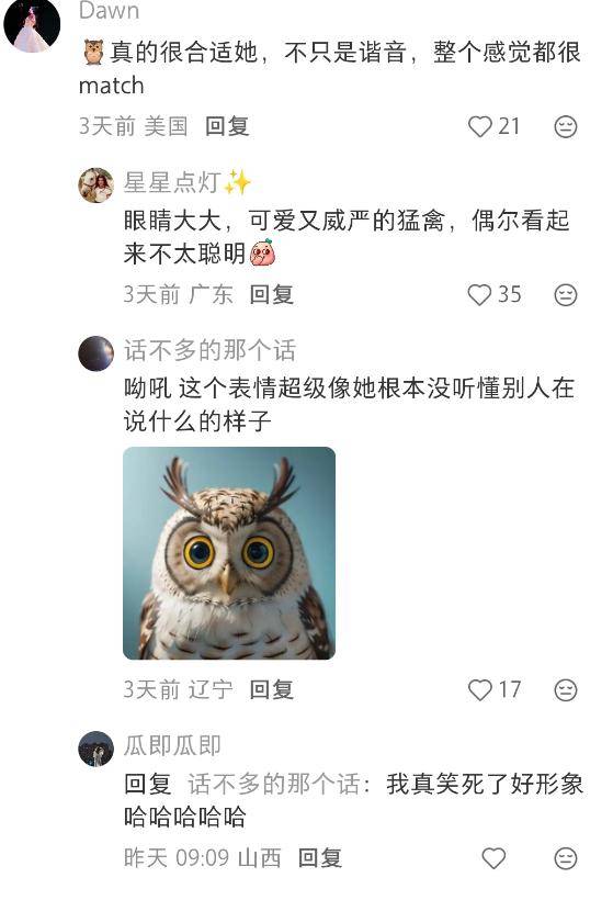 王菲这么配图显然是有用意的,不少网友大胆猜测,可能在她心里的那英就像是猫头鹰一般,看似威猛,实则有些憨厚和迟钝。