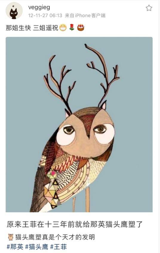 早在13年前,王菲给她庆祝生日时,就配上了一张猫头鹰照片。