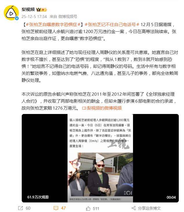 一场涉及1276万港元的陈年合约纠纷,竟意外炸出了张柏芝的“数字恐惧症”。12月5日,张柏芝与前经理人余毓兴的官司在香港高等法院续审,她亲自出庭抛出的这个“心理障碍”,瞬间让法律争议转向了充满戏剧性的个人揭秘。