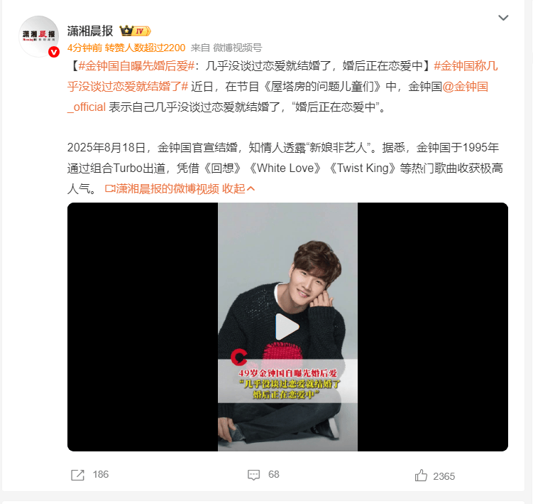 近日,在节目《屋塔房的问题儿童们》中,金钟国@金钟国_official 表示自己几乎没谈过恋爱就结婚了,“婚后正在恋爱中”。