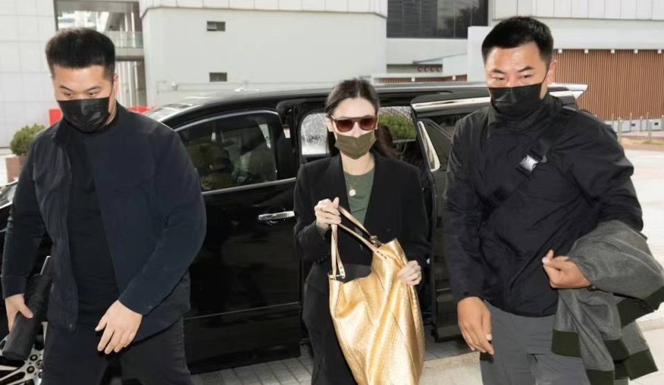 保镖看起来都是180厘米以上的彪形大汉,全身黑的张柏芝看起来很小只。