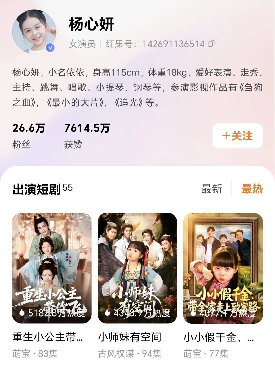 别看这部剧的女主角杨心妍年纪不大,但根据红果数据显示,她已经出演了55部短剧,是妥妥的资深短剧演员。