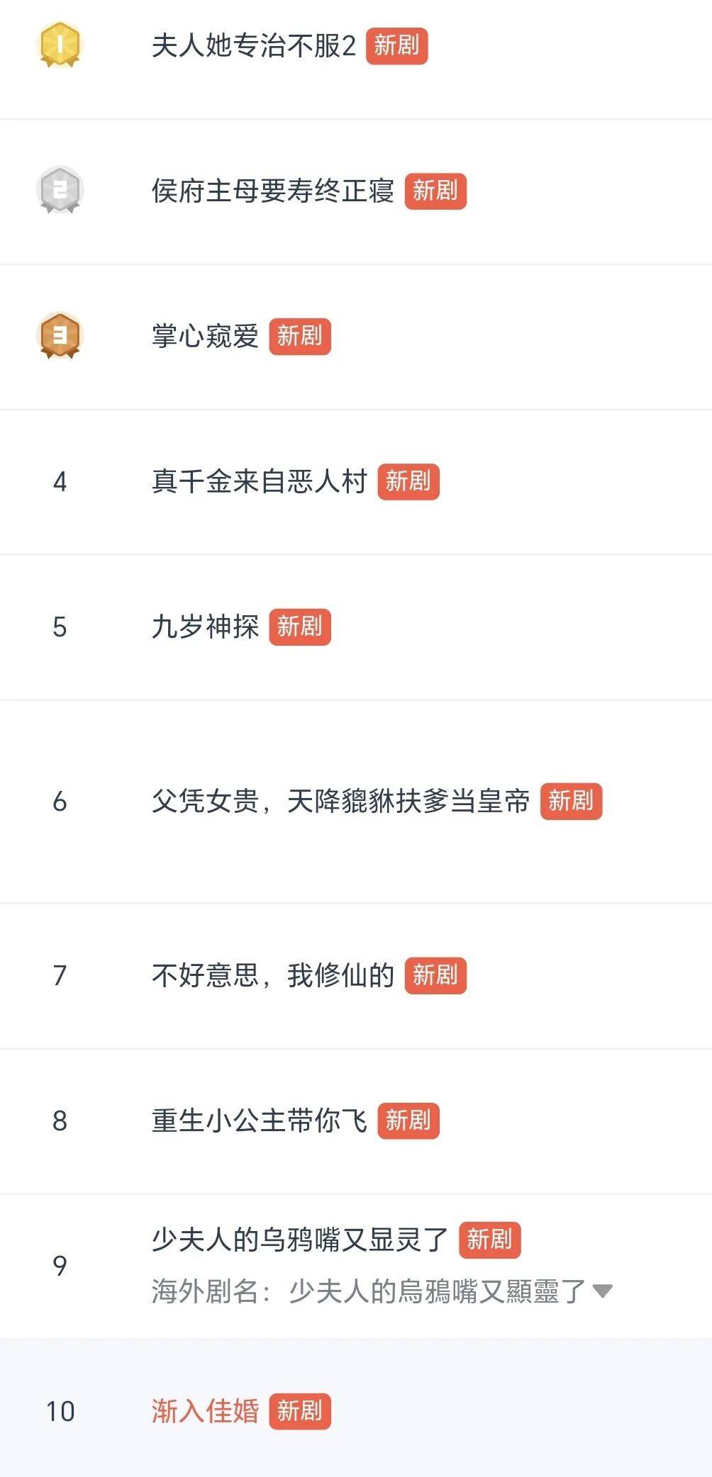 榜首的位置被《夫人她专治不服2》以7681.1万的热度拿下。这部剧改编自番茄IP《哄不了,作精太子爷又茶又哭包》,上一部的播放量超过20亿,作为续集,表现依旧强势。