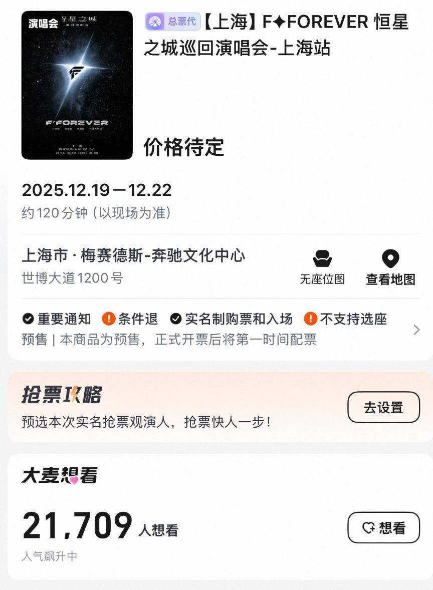 12月4日,大麦网显示,“F✦FOREVER 恒星之城巡回演唱会-上海站”即将开售,此次演唱会将于12月19日至22日在上海梅赛德斯奔驰文化中心举行,票价暂未公布,目前已有2万多人标记“想看”。