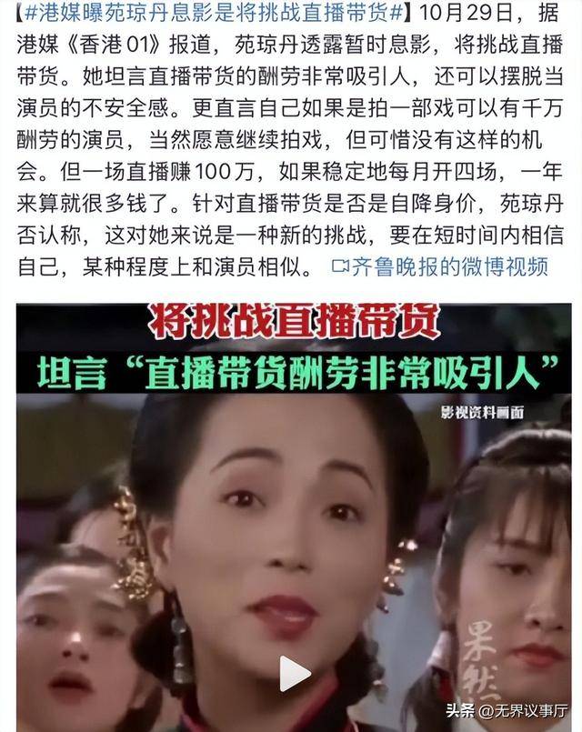 港星苑琼丹更实在,两年前就说直播单场能赚100万元,每月播四场比当影视配角挣得多,如今又跑去景区搞情怀杀拓宽路子。