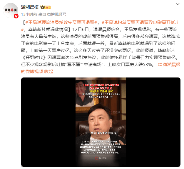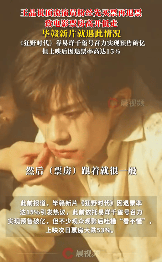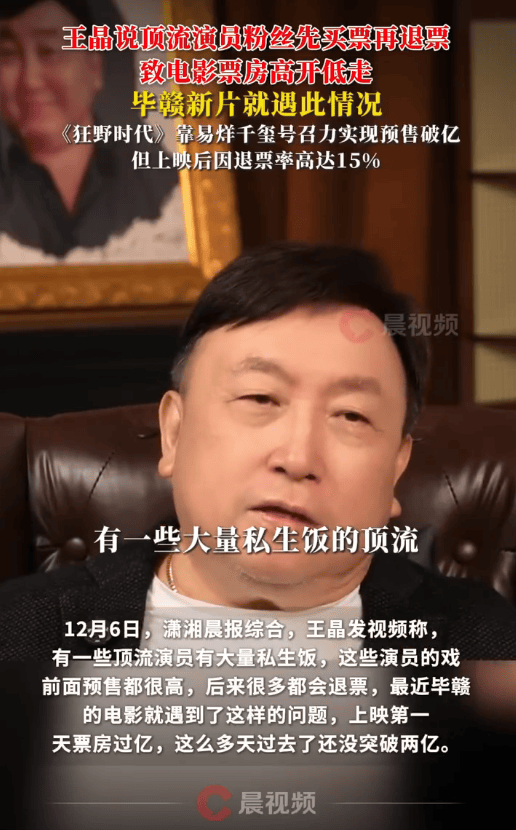 12月6日,潇湘晨报综合,王晶发视频称,有一些顶流演员有大量私生饭,这些演员的戏前面预售都很高,后来很多都会退票,这就造成了有的电影第一天十分卖座,后面就很一般,最近毕赣的电影就遇到了这样的问题,上映第一天票房过亿,这么多天过去了还没突破两亿。此前报道,毕赣新片《狂野时代》因退票率达15%引发热议,此前依托易烊千玺号召力实现预售破亿,但不少观众观影后吐槽“看不懂”“中途离场”,上映次日票房大跌53%。