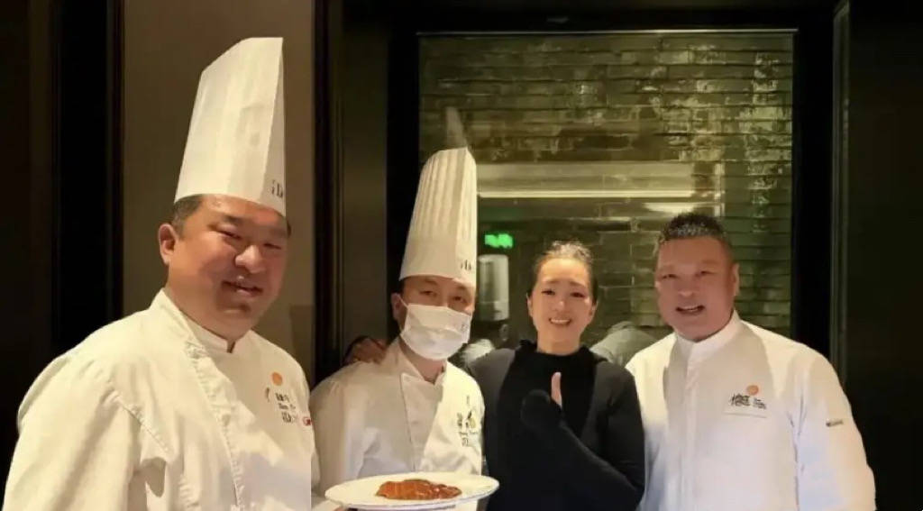 和以往在红毯上的强势霸气不同,私下里的巩俐很平和。她搂着大厨的脖子拍照,就像是邻家姐姐一样温和。