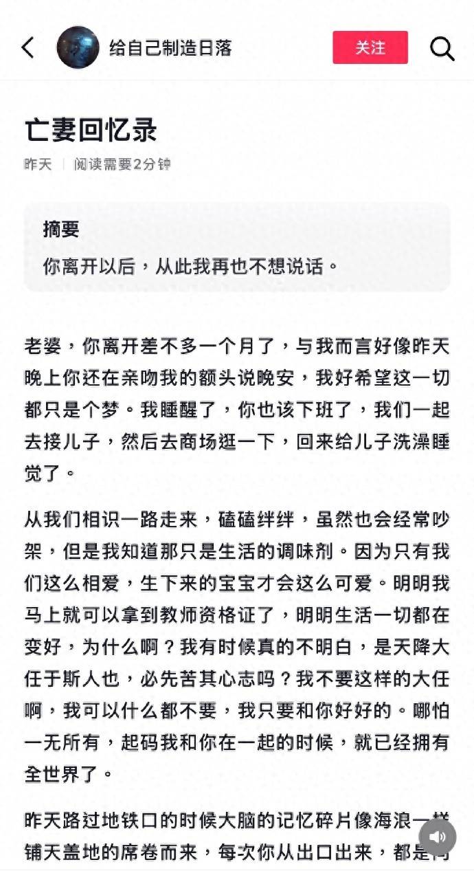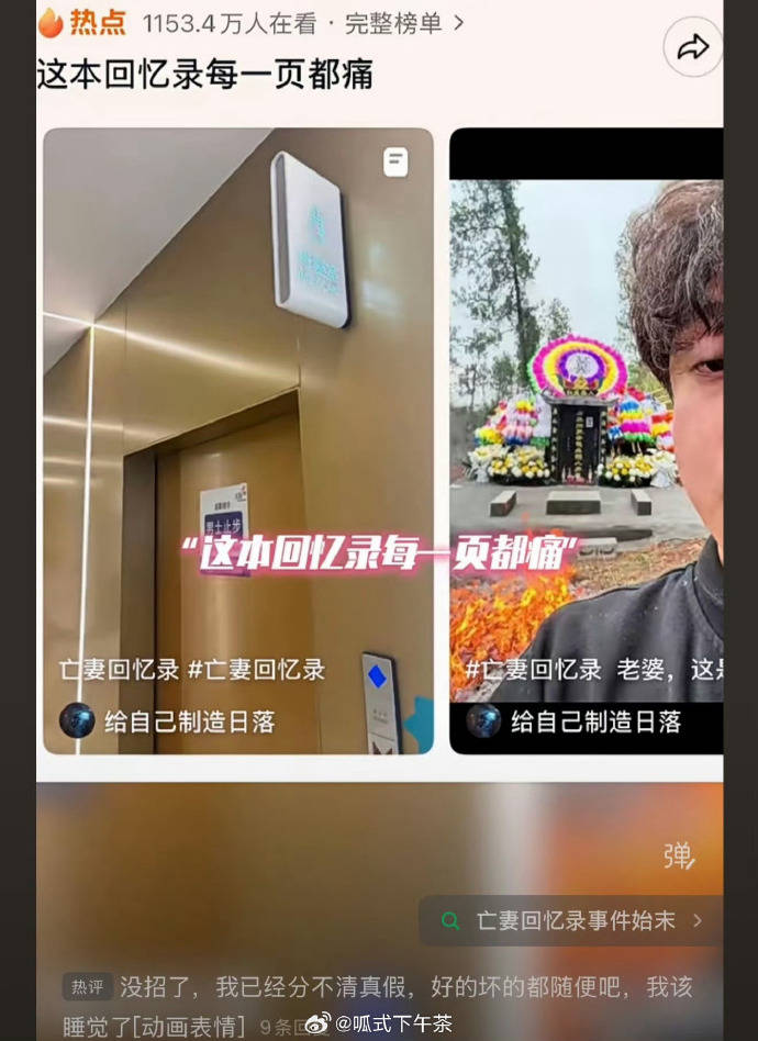 2025年11月,博主邓先生的妻子罗女士因电动车事故离世。此后,他将抖音账号更名为“亡妻回忆录”,密集发布内容:墓碑旁的自拍、地铁站苦等亡妻的身影、一岁半孩子呼唤母亲的画面,配以“不是说好50年后才能离开彼此吗”等文字。视频中,妻子被描绘成阳光开朗的体育老师,是把他“从颓废带入正轨”的光。他声称发布仅为纪念,但单条视频最高宣称获赞85万,粉丝数一度暴涨。