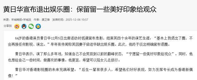 近日老戏骨黄日华突然宣布彻底退出娱乐圈,以后再也不拍戏了。