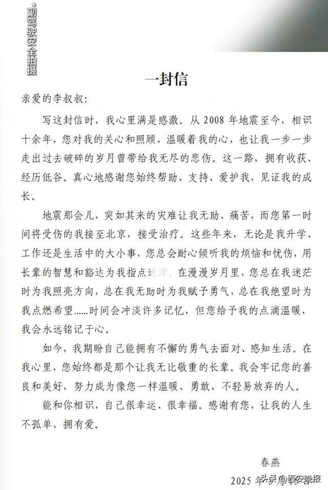 今年3月,朱春燕写了一封信给李亚鹏,信中她细数多年来的照顾与支持,从手术康复到升学工作,从生活烦恼到人生困惑,李亚鹏一直给予支持,她早已将其视作最敬重的长辈。