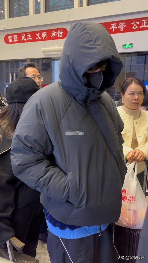 可机场里的他,却没了屏幕上的活力,他穿着灰色连帽棉袄,戴着黑色口罩,径直走到候机区的冷板凳旁坐下。