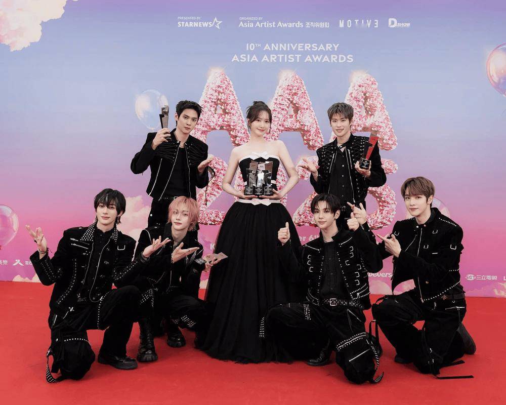 在这张于颁奖礼红毯拍摄的合照中,因歌手及演员成就而受到表彰的允儿,与同样获奖的RIIZE成员们并肩而立。允儿一如既往地散发出优雅迷人的气质,在人群中自然成为焦点。而围绕在她身旁的RIIZE成员们,则被网友们赋予了“守护骑士”的角色。