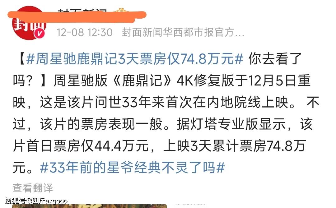 12月8日,截至发文,周星驰版《鹿鼎记》4K修复版重映后,票房只有74万,并且还包含首映第一天的44万票房。