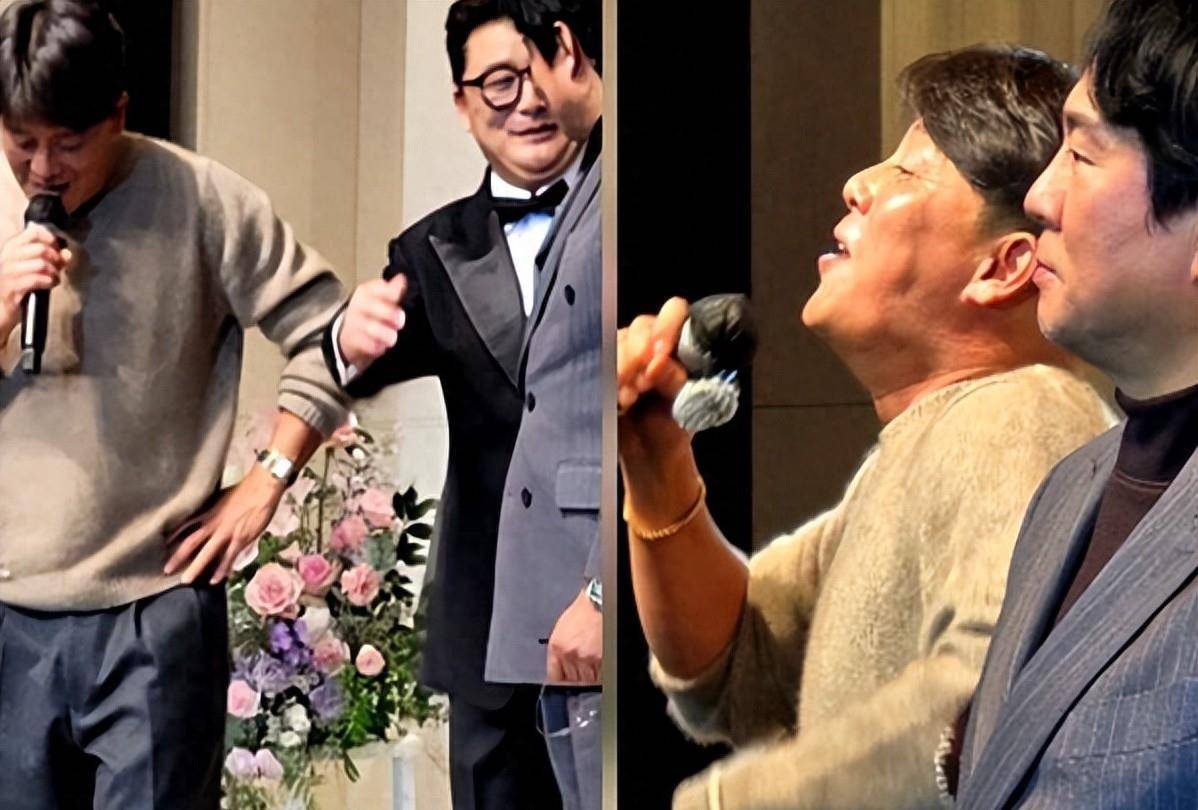 忘词忘得彻彻底底,只能呆立当场。满场宾客顿时笑成一片,新娘更是笑得直不起腰。手足无措的新郎,像抓住救命稻草般朝观众席拼命挥手——目光锁定的,正是李在勋。李在勋明显愣了一下,仿佛在思考:“我今天是来喝喜酒,还是来临时顶班的?”下一秒,他便笑着起身,接过麦克风,一气呵成地唱完了整首歌。