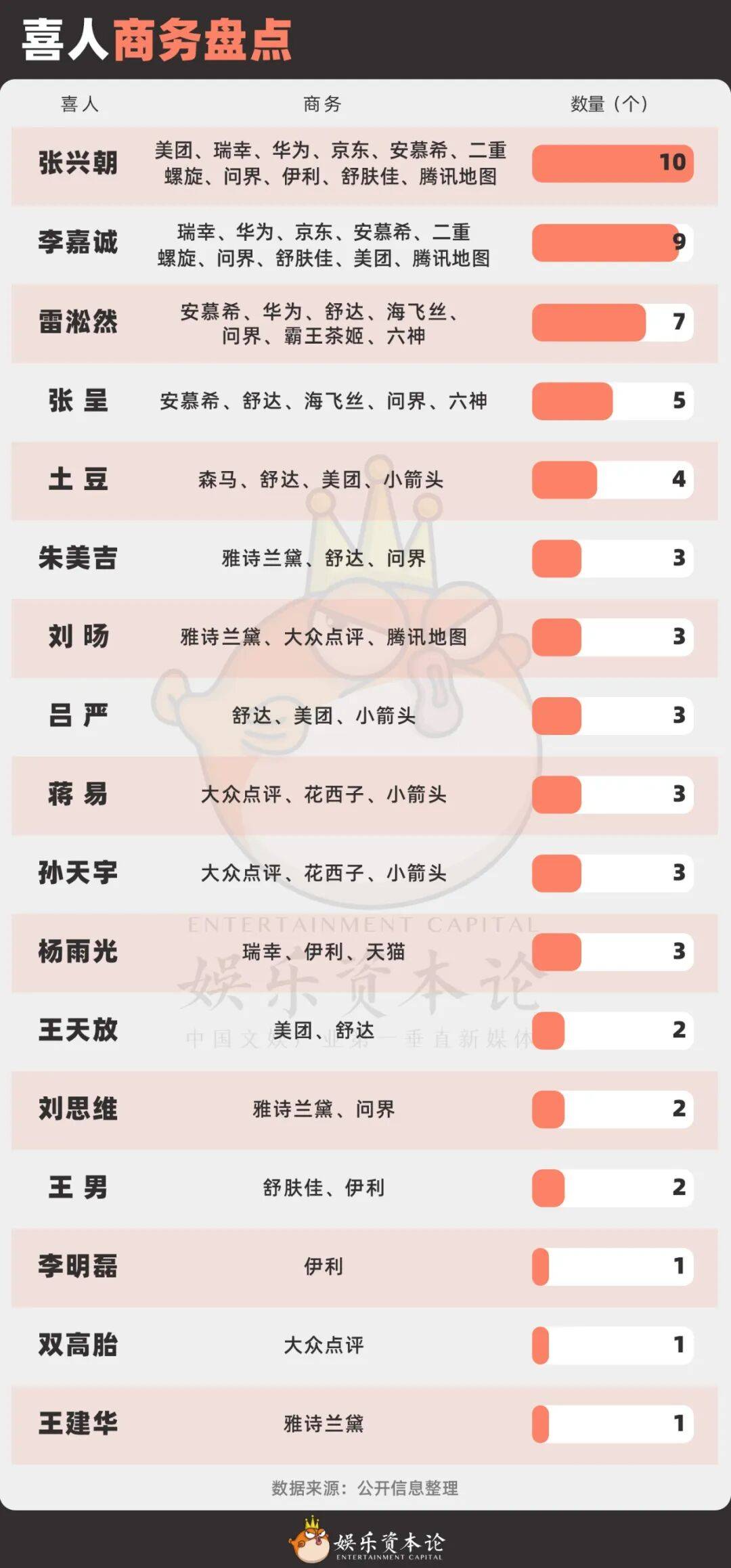 “外星从”拥有着这届喜人最多的商务,除了本就属于综艺内商务的美团、安慕希、问界等,华为、京东、瑞幸、伊利、舒肤佳也向“外星从”的张兴朝和李嘉诚伸出了橄榄枝。
