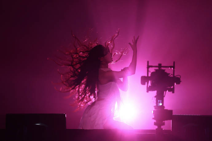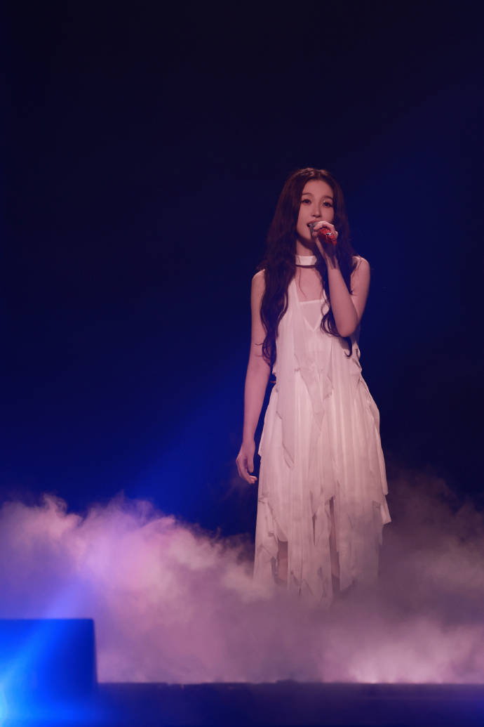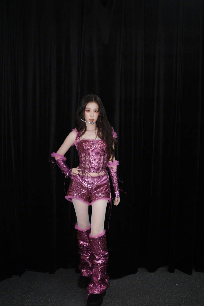 虞书欣辣妹造型与光脚白纱舞台的反差感十足。