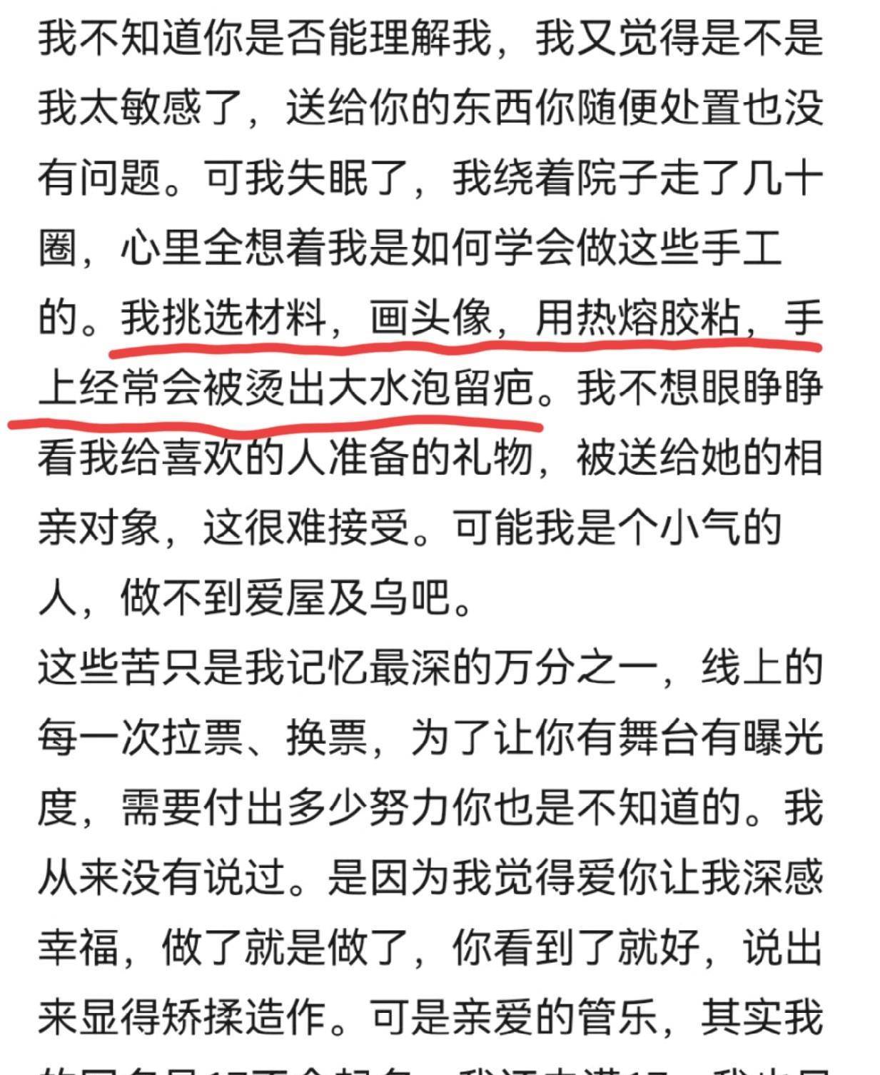 粉丝痛心地描述:这是她第一次学做手工,不熟练,为了偶像精心挑选材料、画头像,手被热熔胶烫出泡……字里行间全是心血。