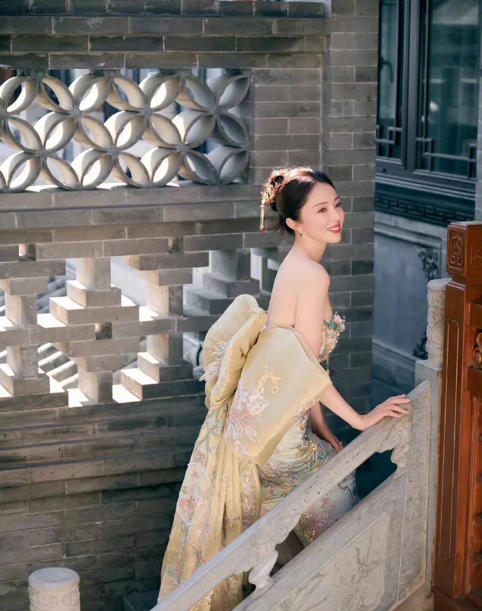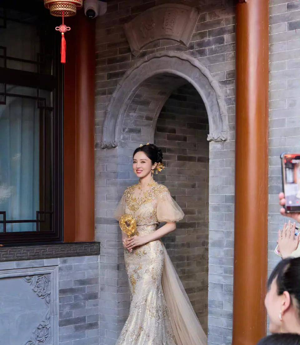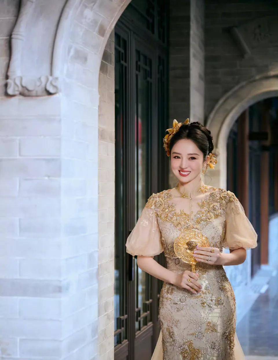 照片中,董璇身披金色礼服,头戴华丽金饰,宛若古画中走出的贵妃,凤冠霞帔,摇曳生辉,仪态万千。亮相的那一刻,惊艳四座。
