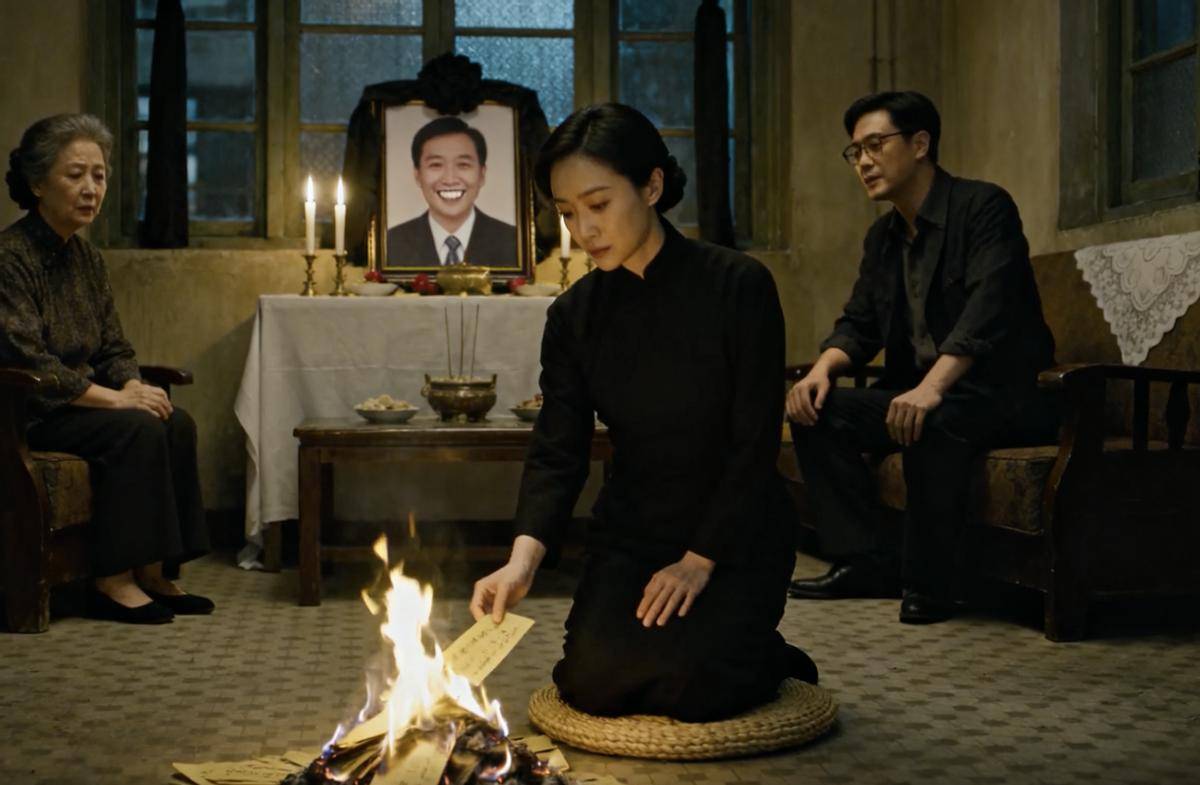 周嘉诚的葬礼办得极其冷清和压抑。家里简单设了个灵堂,照片上的他还在笑着,牙齿很白。林晚秋穿着一身黑衣,跪在蒲团上,面无表情地烧着纸钱。火光映着她的脸,明明灭灭,看不出悲喜。