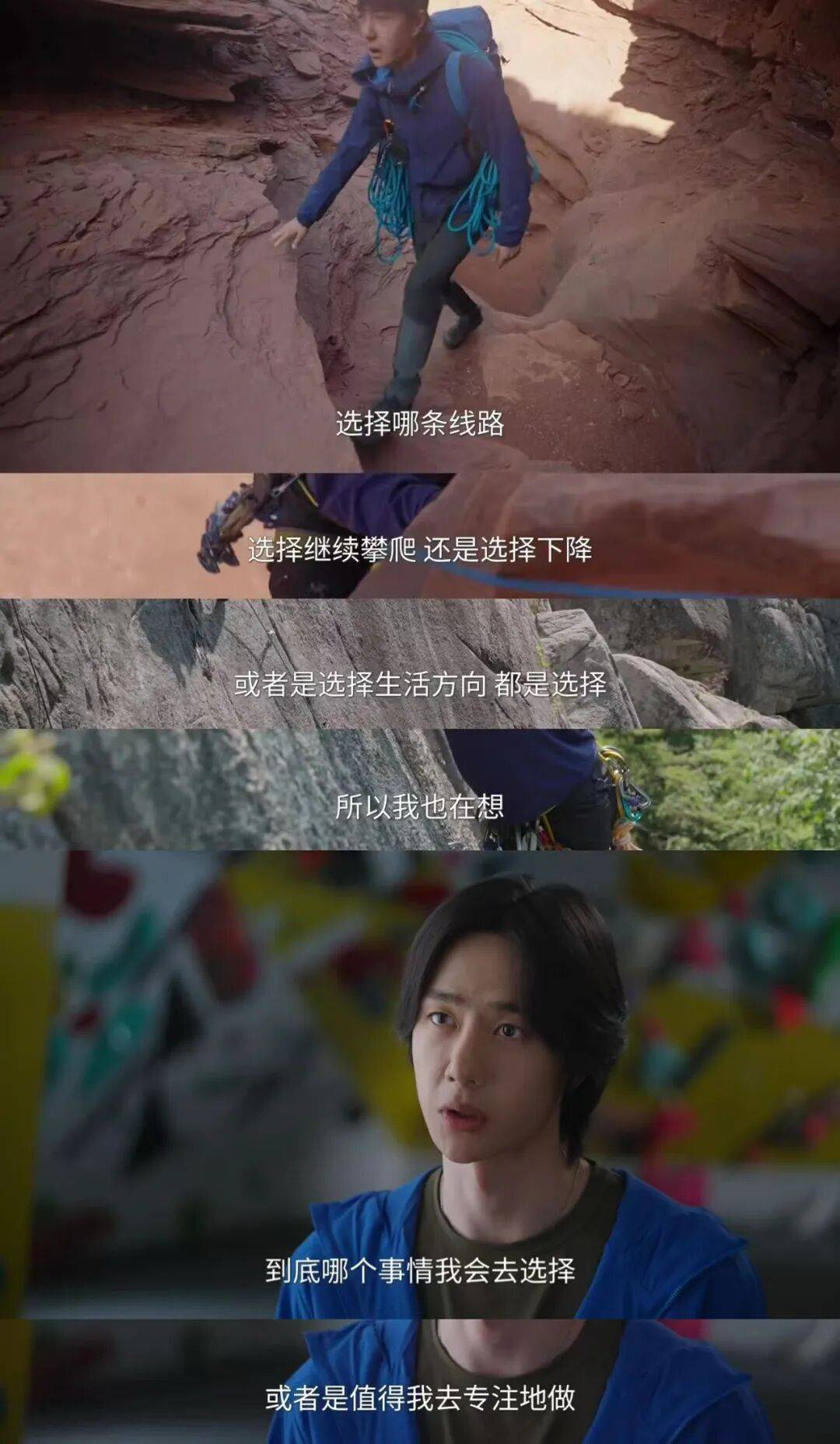 攀岩作为极限运动,其实算是大众生活中不常接触的内容。但看着王一博手指磨破、肩膀酸痛仍不懈攀登,最终站在顶峰的那一刻,屏幕外的观众也会忍不住热泪盈眶,这不就是我们的人生么?