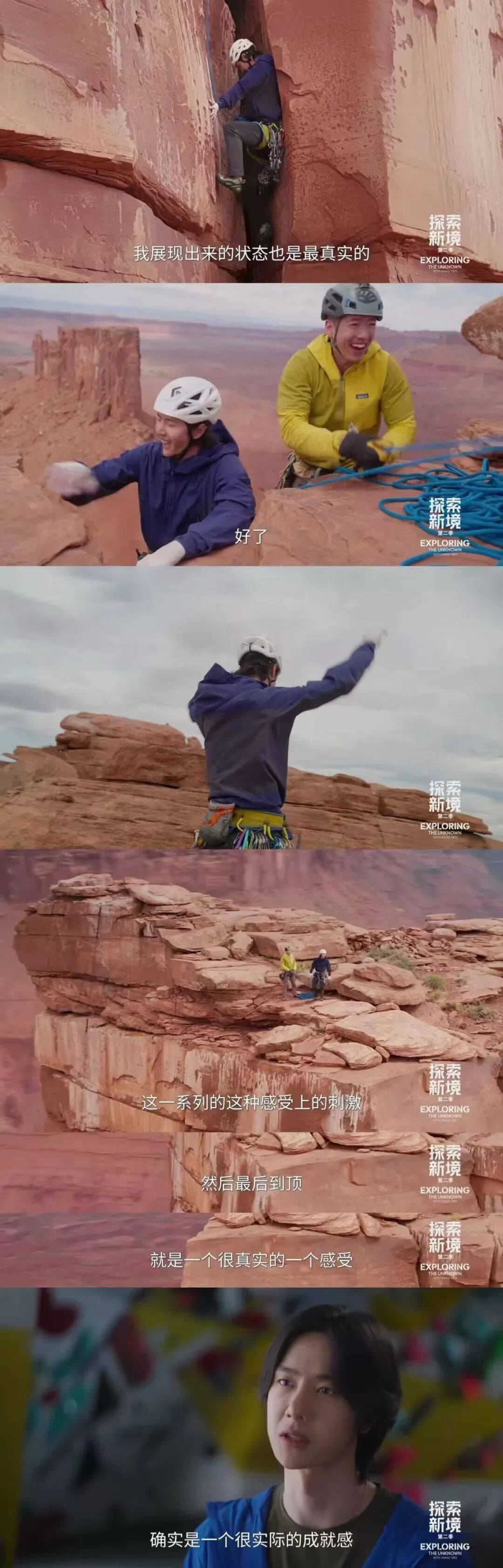 在峡谷中迷路,王一博爬上房车顶,眼前是两条分岔路口。如果说《探索新境》第一季是寻找未知,第二季的关键词则是选择。王一博的答案是攀岩,它是自己学习人生的锚点,也是寻找自我的方式,“不断地探索新境,无时无刻不在挑战自己,然后突破自己的困难,会比较吸引我。”