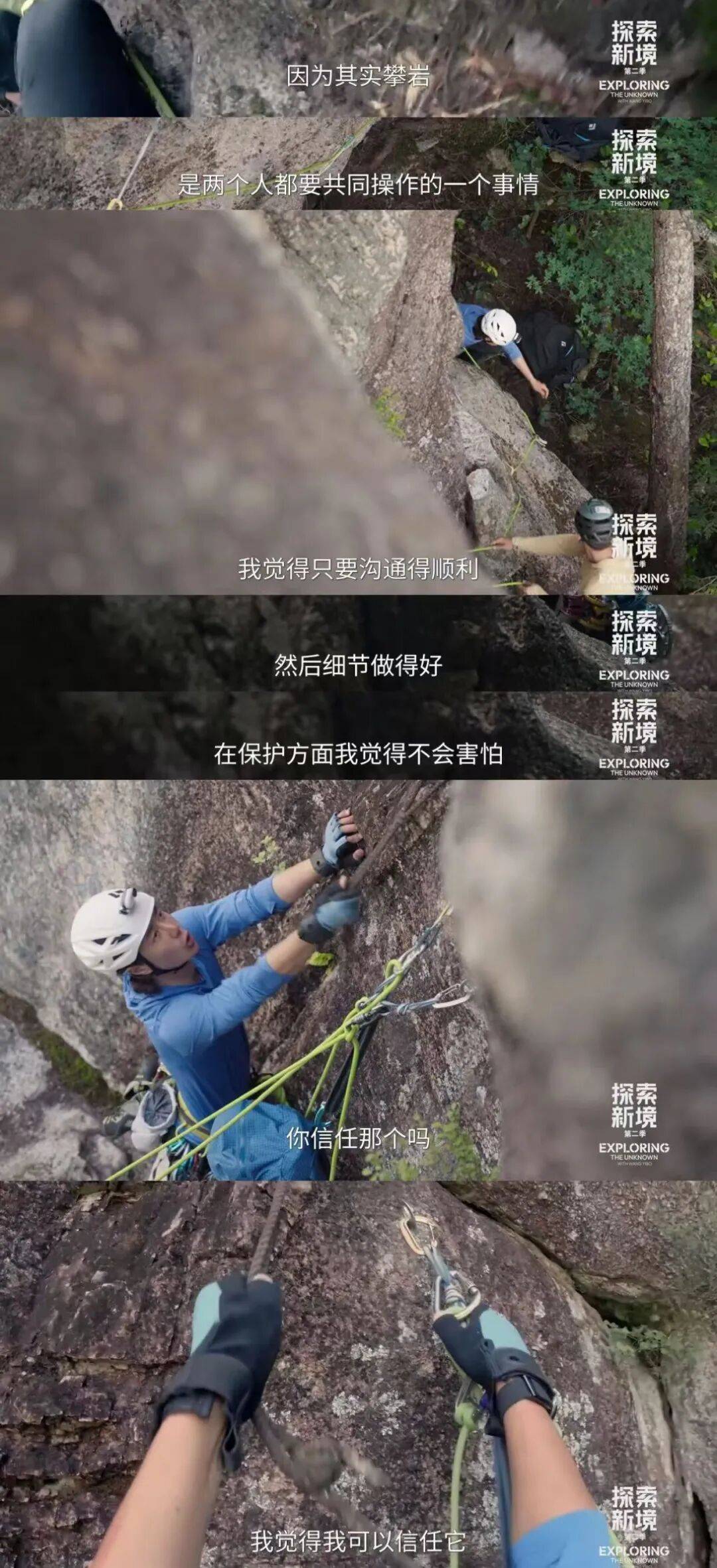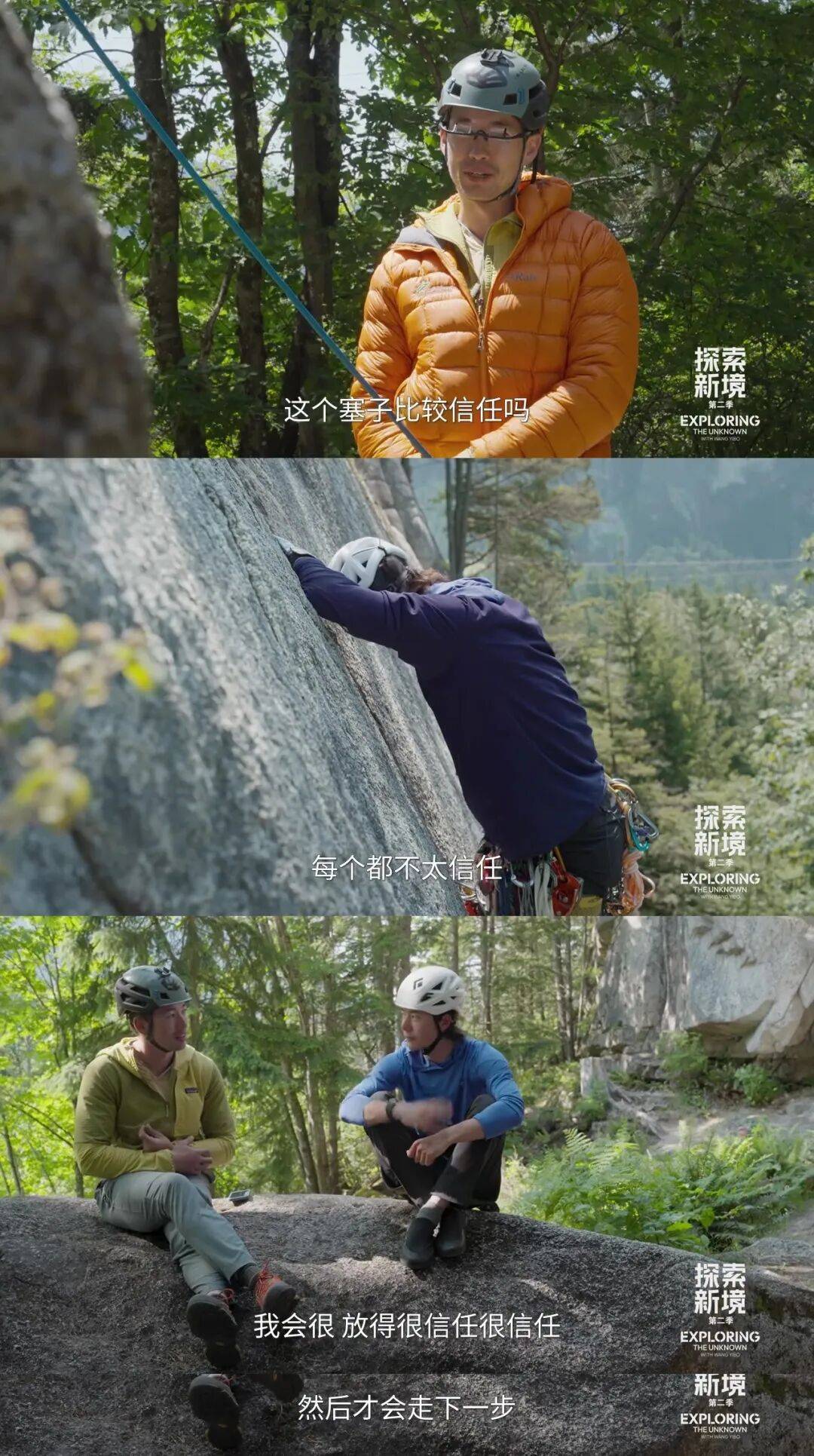 磨合碰撞中打破隔阂,为共同的目标热烈奔赴,让两周前还是素昧平生的陌生人,成长为在岩壁上相互保护、密切合作的伙伴。当瑞德再次问起“你信任那个岩塞么”时,王一博不假思索地回应:“我觉得我可以信任它。”