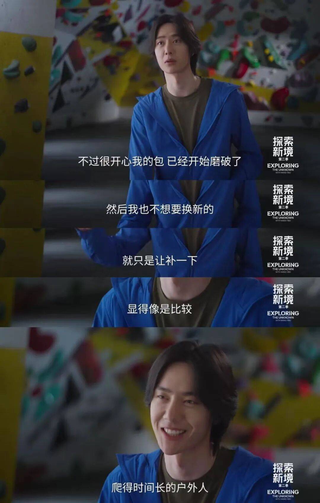 如何平衡压力与松弛,怎样面对团队配合与自我独处,与人竞争还是与自己较量......王一博在探索的攀岩哲学,其实恰是活在当下、修炼心境的智慧:心有所期、全力以赴,每一步攀登都算数。