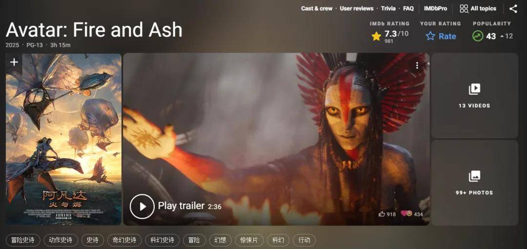 IMDb的评分也已出炉,目前高达7.3分,作为一部特效大片相当之高。