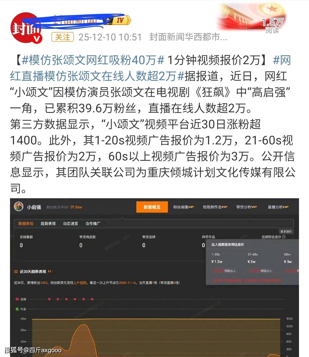 12月10日,#模仿张颂文网红1分钟视频报价2万#的话题冲上热搜,谁能想到,《狂飙》都过去这么久了,还能让一个网红彻底“起飞”?
