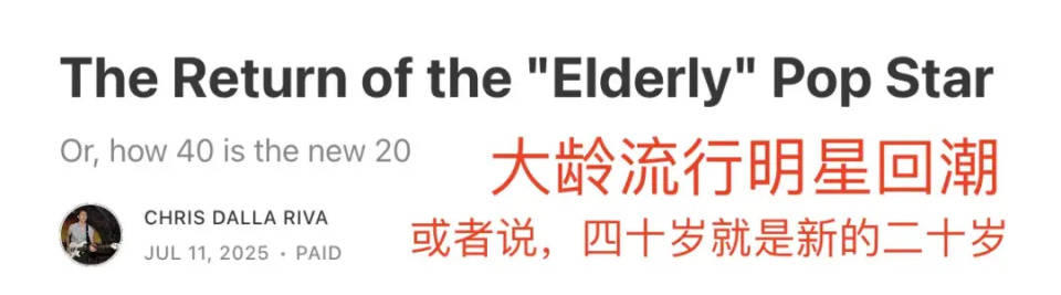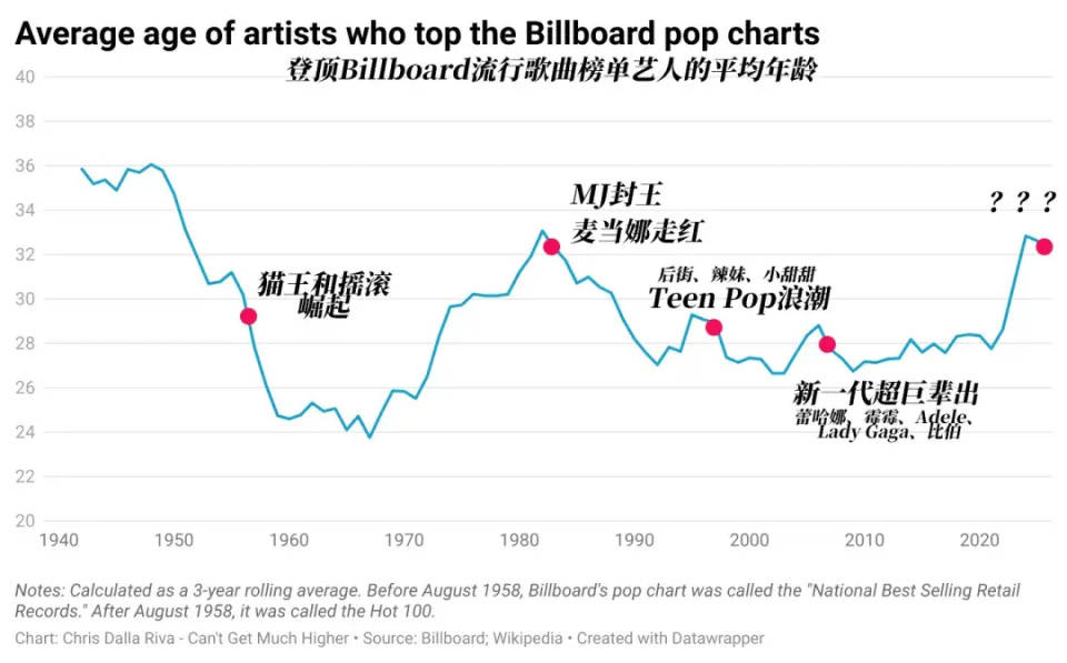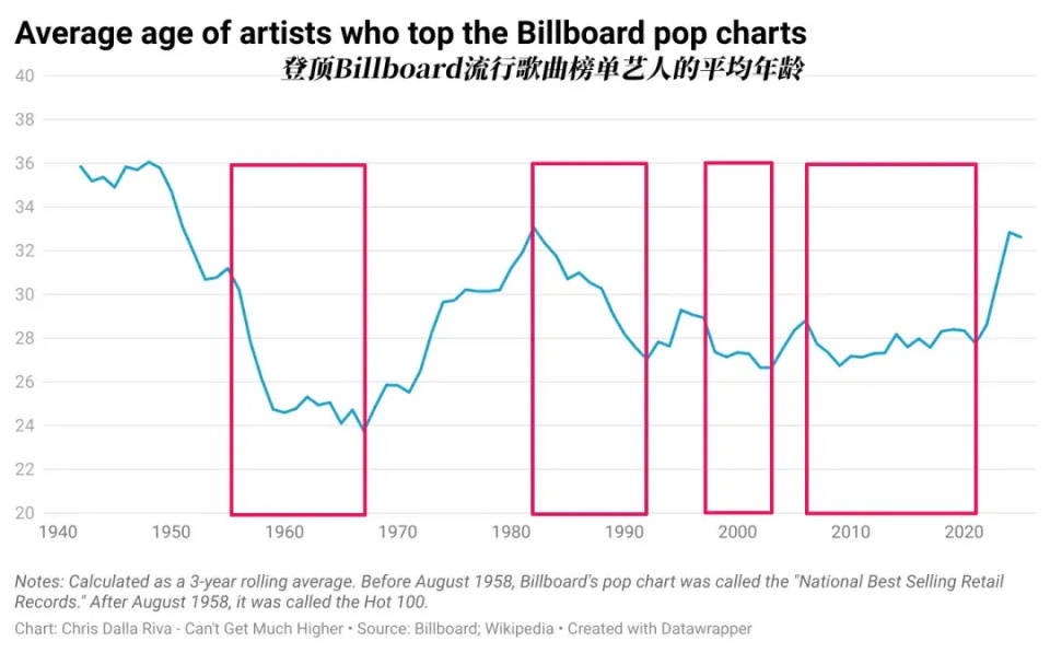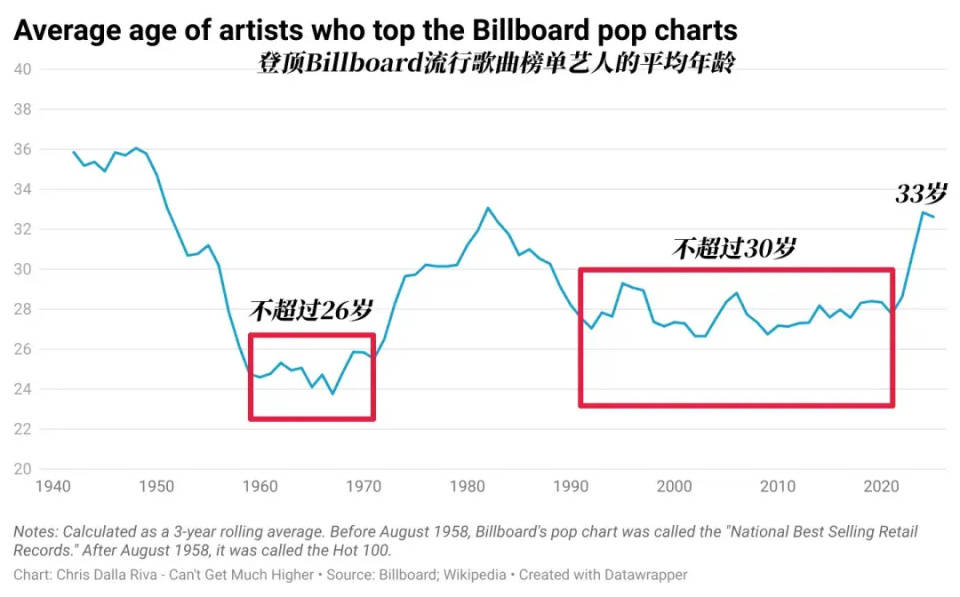 音乐人兼学者克里斯·达拉·里瓦(Chris Dalla Riva)在研究了过去80年来的Billboard Hot100榜单后得出这样一个结论:“40岁是新的20岁!”