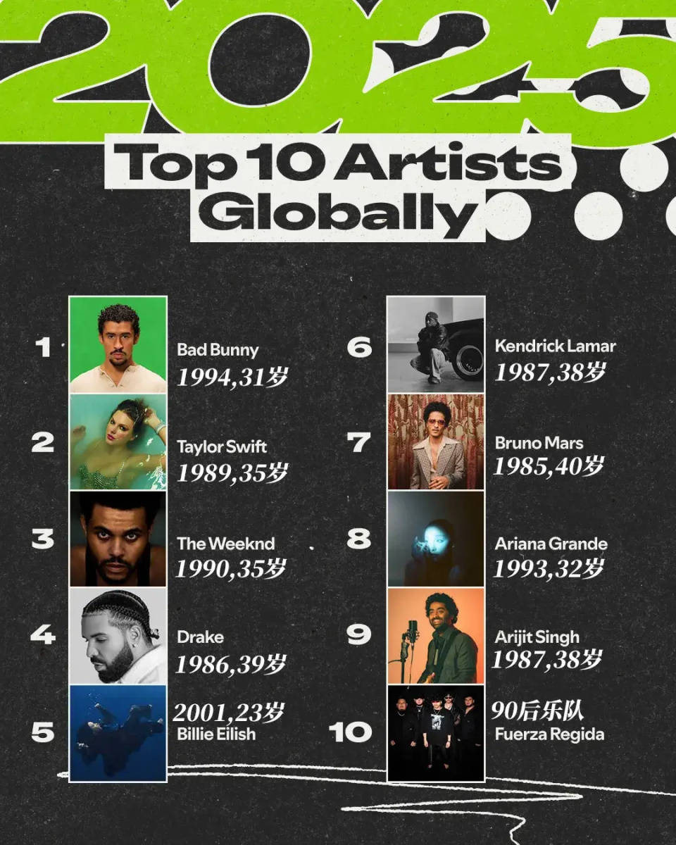 Spotify日前公布了2025年该平台上全球最火的十组艺人,有一半出生于上世纪八十年代,8位艺人的年龄大于30岁,00后只有碧梨(Billie Eillish)一位,十组艺人的平均年龄约34岁。