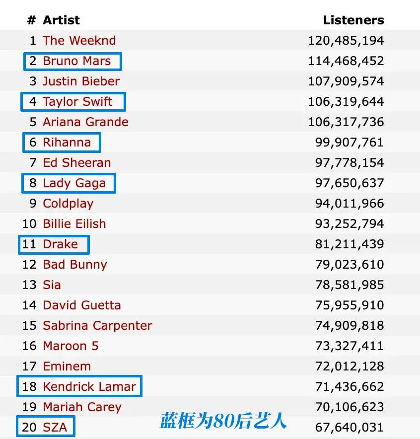 如今的音乐圈,80后仍然是扛把子,Taylor Swift、Lady Gaga、Bruno Mars、Drake、Kendrick Lamar和SZA等仍然掌管着流行趋势;90后们正在努力改变格局,The Weeknd、Ariana Grande和Bad Bunny等艺人都已经拥有了自己稳固的顶流地位。