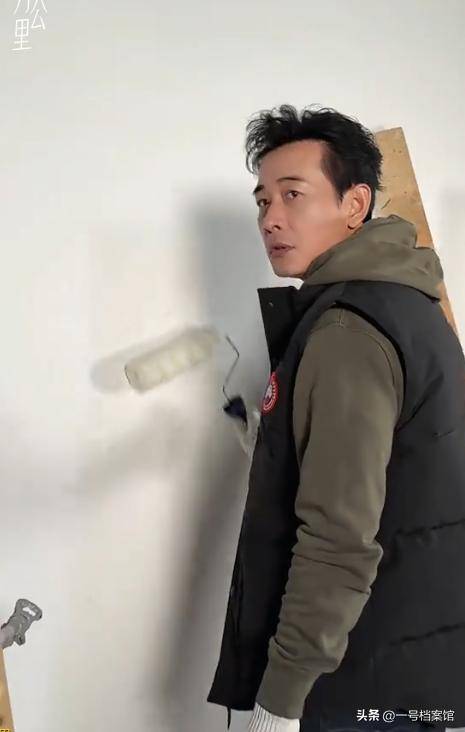 镜头一转他拿起了刷墙的根据在墙上滚动着,穿着一件黑色的马甲里面则是一件绿色的带帽卫衣,手上还佩戴着一副白色的手套,