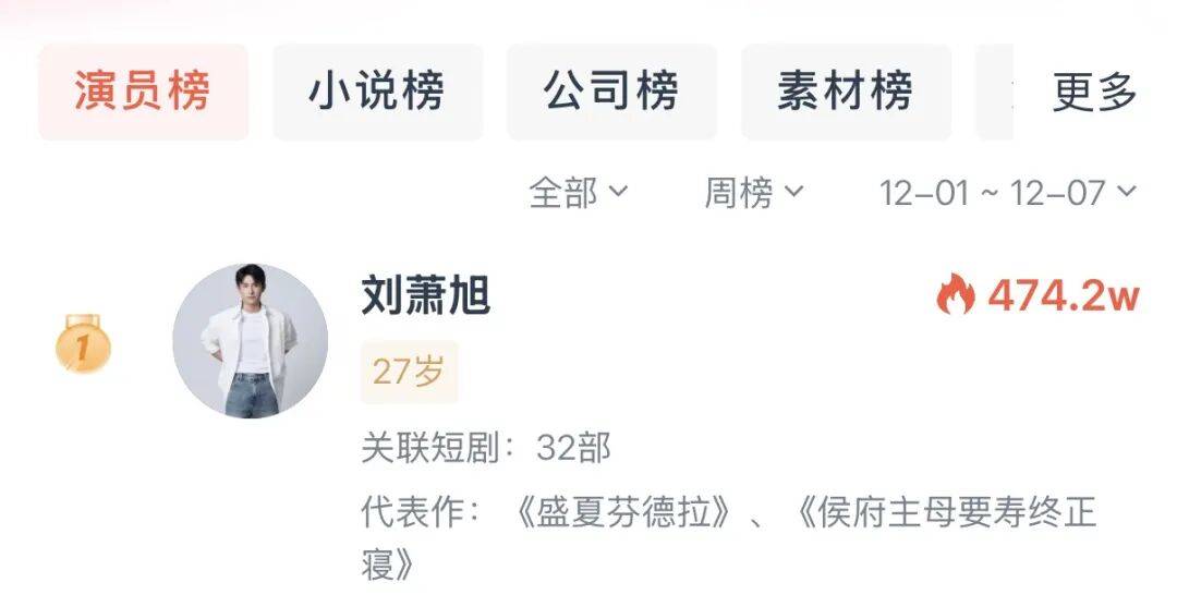 刘萧旭作为新晋的“短剧一哥”,本期有两部主演作品上榜。凭借这些作品的热度,他已在演员榜上连续两周蝉联第一。