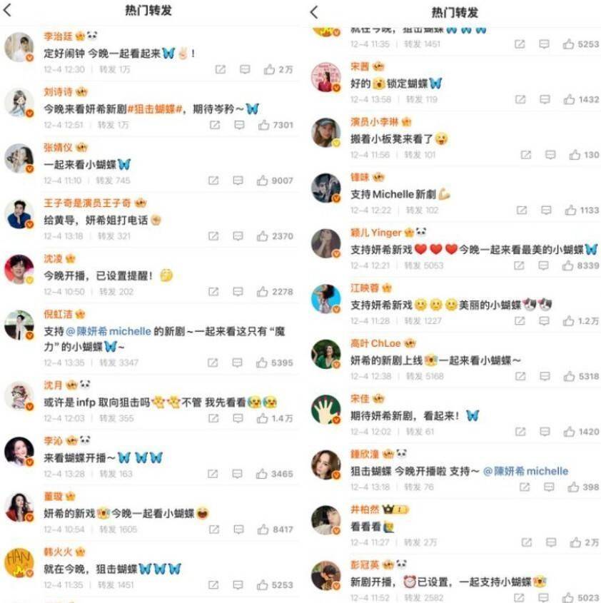12月4日,陈妍希与周柯宇主演的电视剧《狙击蝴蝶》迎来首播。