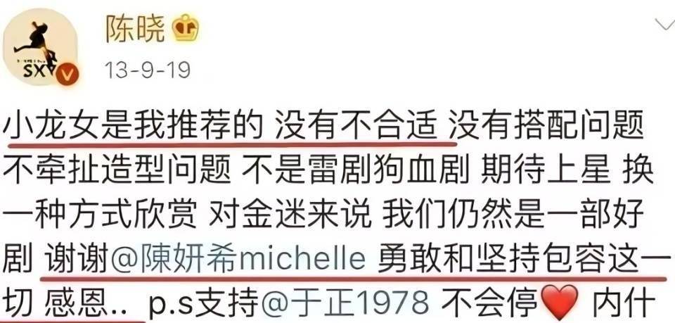 然而《神雕侠侣》播出的时候,陈晓和陈妍希已经处于交往状态。