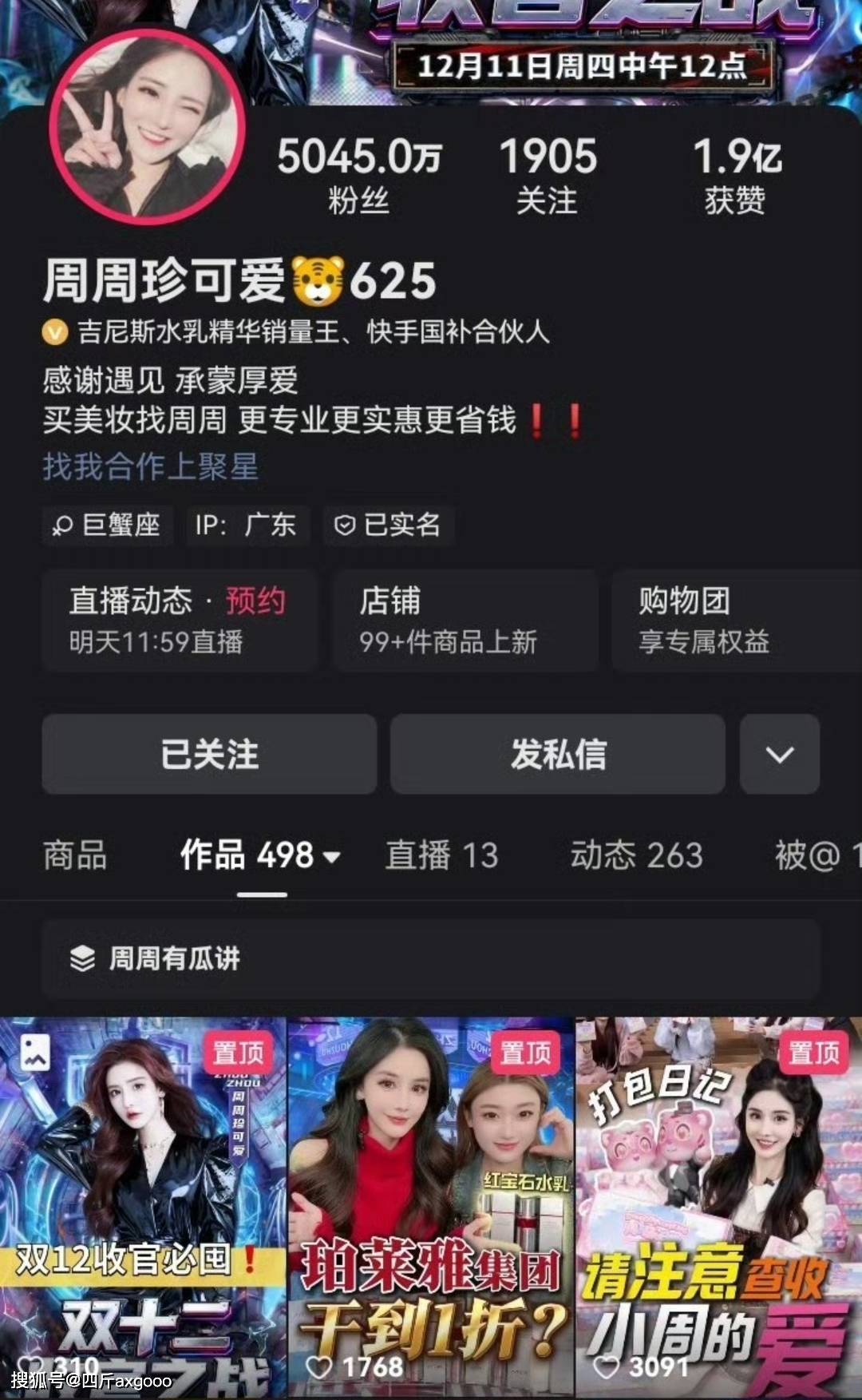“周周珍可爱625”,本名叫周珍,在短视频平台可是实打实的头部美妆主播。
