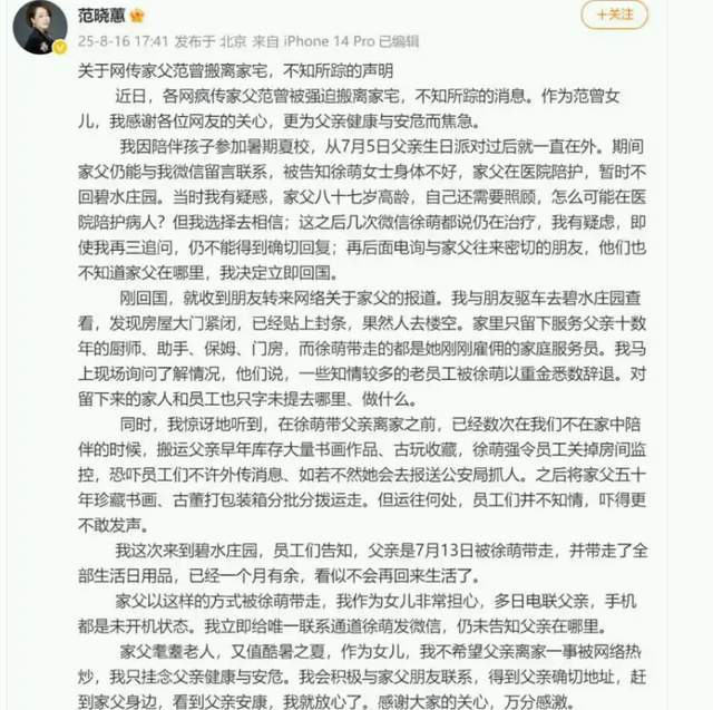 要知道,范曾女儿范晓蕙之前的声明不过是担心其父亲,至于一些所谓的质疑更是无从谈起,如今这样的声明让人有些意外。