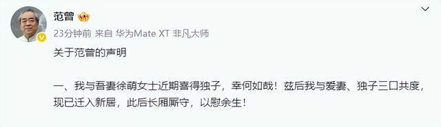 范曾透露,他与娇妻徐萌近期喜得爱子,为了享受生活,特地搬到了新的住宅,并决定三人长相厮守,以慰余生。