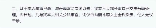由于年事已高,所以范曾表示自己将会把所有的事情全部交给现在的妻子徐萌。