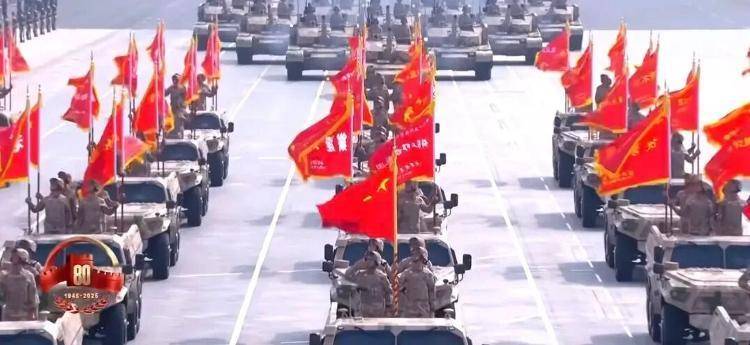 在纪念中国人民抗日战争暨世界反法西斯战争胜利80周年的盛大的阅兵仪式上,80面抗战英模部队荣誉旗帜组成的战旗方队缓缓驶过天安门广场。