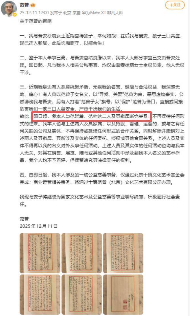 12月11日,87岁的国画大师范曾发布三则声明,不仅宣布与现任妻子徐萌喜得一子,还明确表示将与亲生女儿范晓蕙、继子范仲达断绝一切关系。