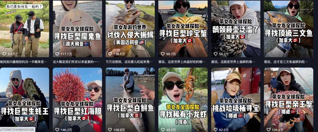 原本主攻钓鱼的大豪夫妇,也从全国钓鱼转向“全球探险”,其视频横跨海钓界、旅游界和吃播界,其中小龙虾、帝王蟹、三文鱼、巨型生蚝等高端海鲜泛滥系列,几乎条条百万点赞。
