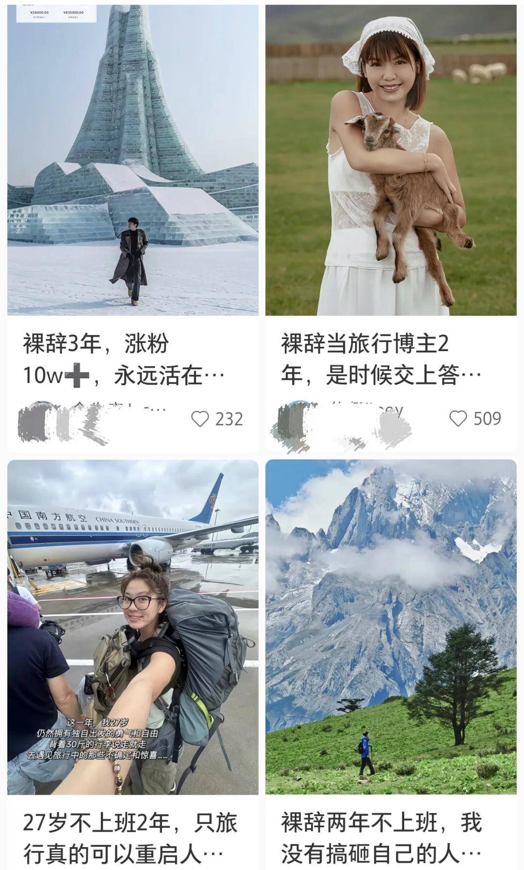 在短视频平台,裸辞当旅行博主后奔向自由的爽文数不胜数,吸引了不少在工位煎熬的社畜。