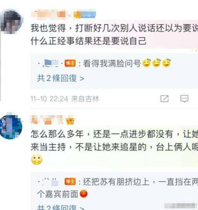 2019年的一场大型晚会,她多次抢汪涵和何炅的话,即使何炅两次用手肘提醒,她仍继续发言,最后汪涵不得不提高音量强行打断她。