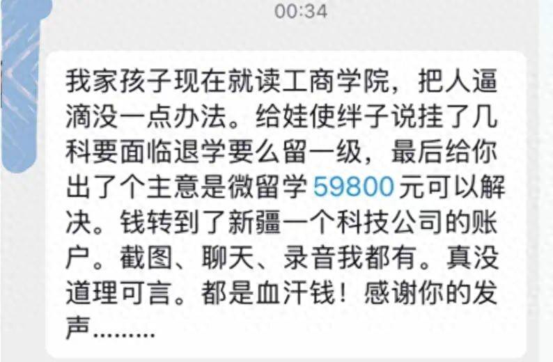 校方的敛财手段,早把教育伦理扔到了十万八千里之外。辅导员先是以宿舍纪律、着装问题找学生的毛病,再用“挂科留级或退学”制造恐慌,精准拿捏住家长“为了孩子可以忍气吞声”的心理。邬女士缴费换宿舍后,协议约定的留学行程石沉大海;黄女士交钱后,既拿不到发票,钱款还流入新疆伊犁的一家科技公司。更恶劣的是,学校还蛮懂“说话艺术”,会议中教唆教师使用“攻心策略”,暗示要进行利益交换,表面禁止项目与评奖评优挂钩,实则引导家长联想缴费后的“特殊待遇”。